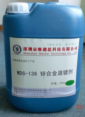 WDS-136 锌合金退镀剂是一种不含氰化物,操作简单,镀层退镀彻底的产品。能充分的退除铬、镍、铜镀层,直至锌合金底材(原胚),能够磨光后再重新电镀,且完全不影响电镀后工件表面的光洁效果,性能极为卓越。